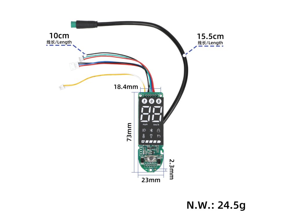 Tato displejová deska je vylepšená verze určená pro výměnu poškozeného nebo nefunkčního dashboardu. Zajišťuje stabilní zobrazení údajů a správnou komunikaci se systémem koloběžky.