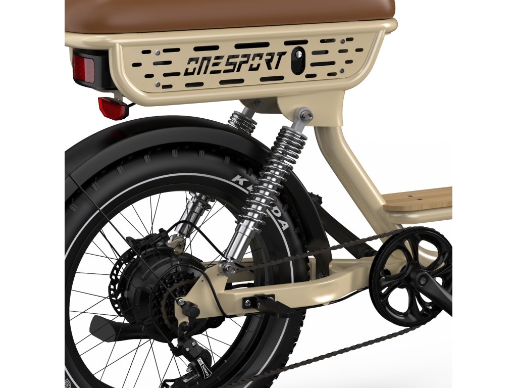 Kolo Onesport W77 je vybaveno přední vidlicí z hliníku s ocelovýma nohama a 135 mm cestováním, která zajišťuje komfortní jízdu na nerovných površích. Zadní odpružení s jarním systémem a nosností 300 lbs poskytuje dodatečné pohodlí při jízdě po tvrdších površích.