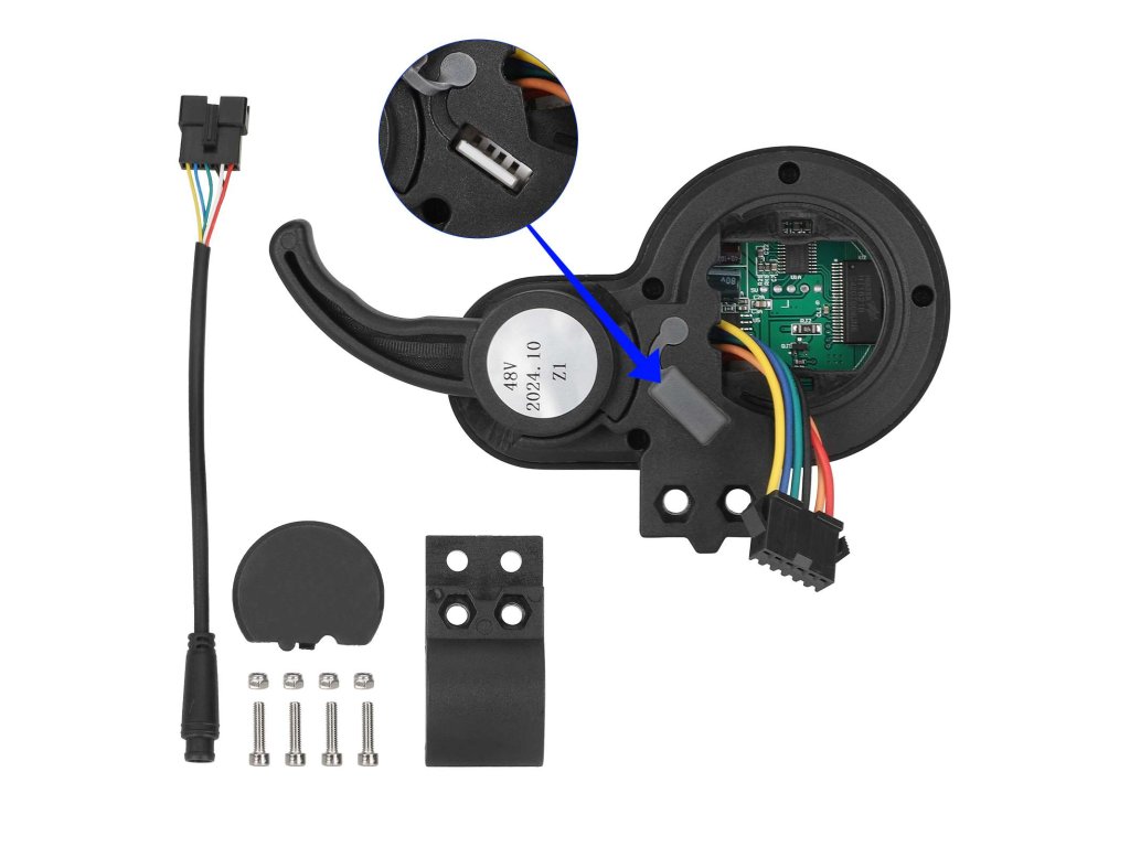 Digitální displej s integrovaným palcovým akcelerátorem a přepínačem rychlosti.
