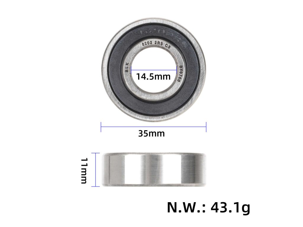 Vnitřní průměr 15 mm, vnější průměr 35 mm a šířka 11 mm odpovídají standardu 6202. Tento rozměr je často používán v elektromotorech, kolech a rotačních mechanismech.