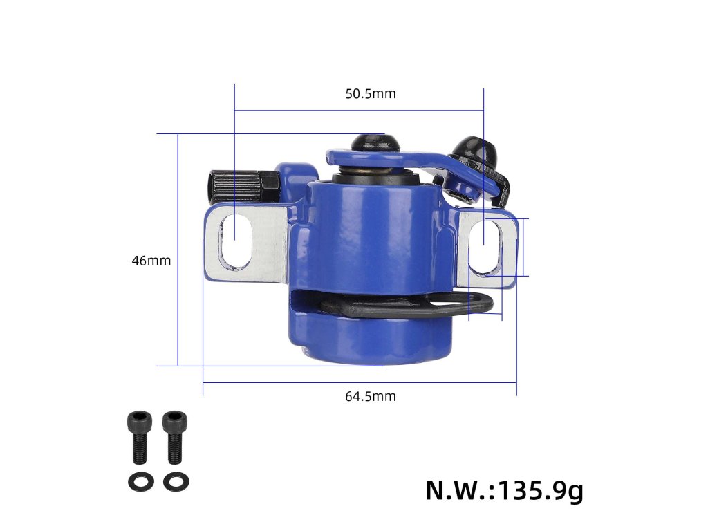 Modrý brzdový třmen určený pro zadní kolo elektrických koloběžek Xiaomi 3 (Mi3) a Xiaomi 4 Pro. Levostranné provedení, spolehlivý brzdný účinek a přesná náhrada originálního dílu.