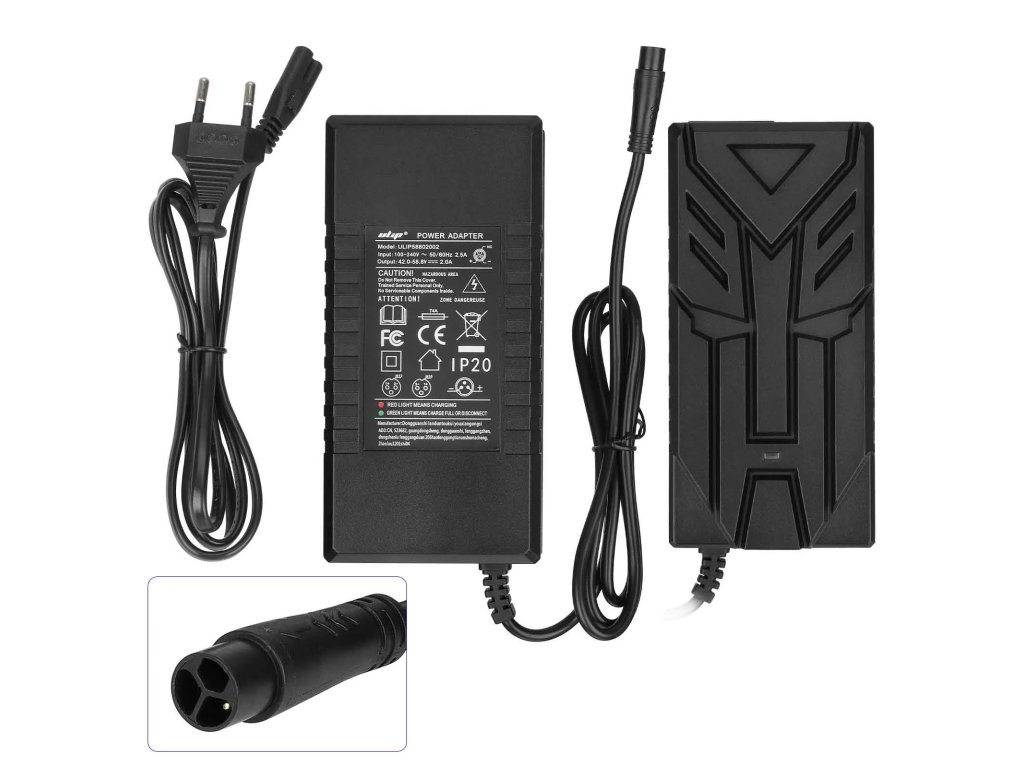 Univerzální nabíječka 42V 2A s konektorem DC2.1 a evropskou zástrčkou, vhodná pro mnoho elektrických koloběžek. Poskytuje stabilní, bezpečné a efektivní nabíjení baterie.