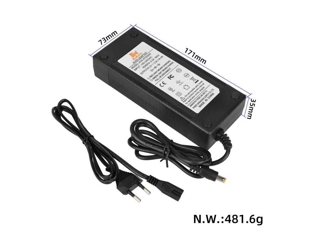 Výkonná nabíječka 54.6V 2A s konektorem DC2.1 a evropským standardem zásuvky. Vhodná pro elektrické koloběžky s 48V baterií, nabízí rychlé a bezpečné nabíjení.