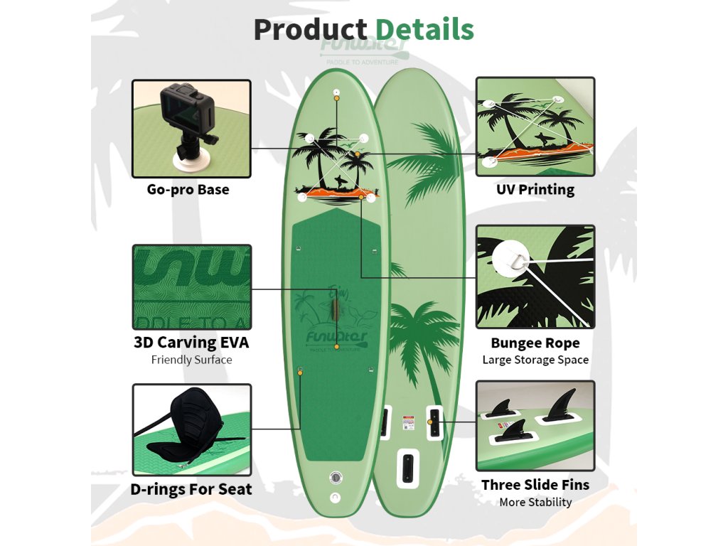 Objevte dokonalé spojení stylu, stability a výkonu s paddleboardem FunWater IslandPalm . Tento univerzální SUP board je ideální pro začátečníky i pokročilé jezdce, kteří hledají spolehlivého společníka na klidných jezerech, řekách i při mírných mořských vlnách. Jeho tropický design dodá každé jízdě jedinečnou atmosféru.