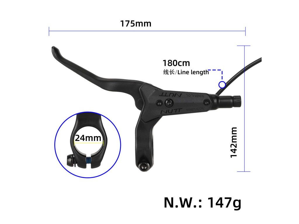Originální levá hydraulická brzdová páčka NUTT Y5 s automatickou funkcí vypnutí motoru a 380 mm vodotěsným 2žilovým kabelem. Určena pro elektrické koloběžky a kola, včetně...