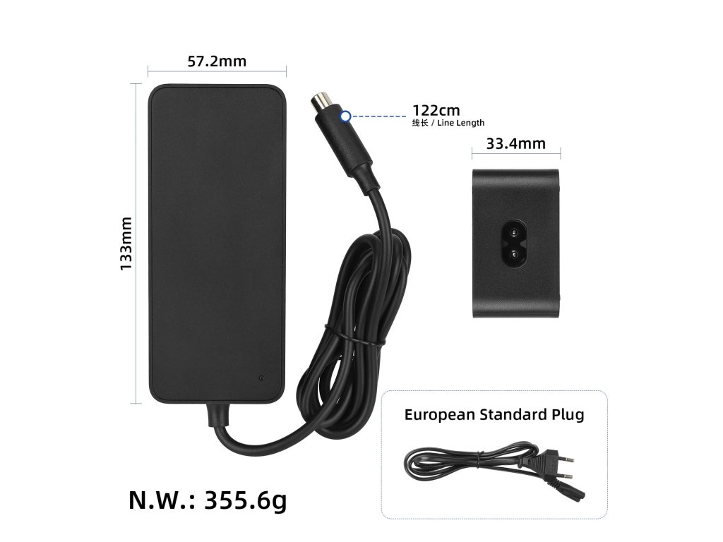 Univerzální nabíječka 42V 2A s konektorem DC2.1 a evropskou zástrčkou, vhodná pro mnoho elektrických koloběžek. Poskytuje stabilní, bezpečné a efektivní nabíjení baterie.