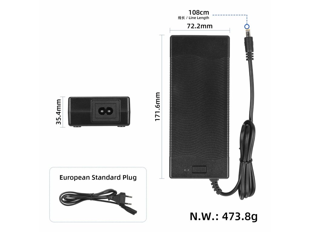 Náhradní nabíječka 54,6 V/2 A s velkým konektorem LP16-3P (Big Eight Ming) a evropskou zástrčkou. Určena pro elektrické koloběžky a zařízení s 48 V Li-ion baterií. Zajišťuje...