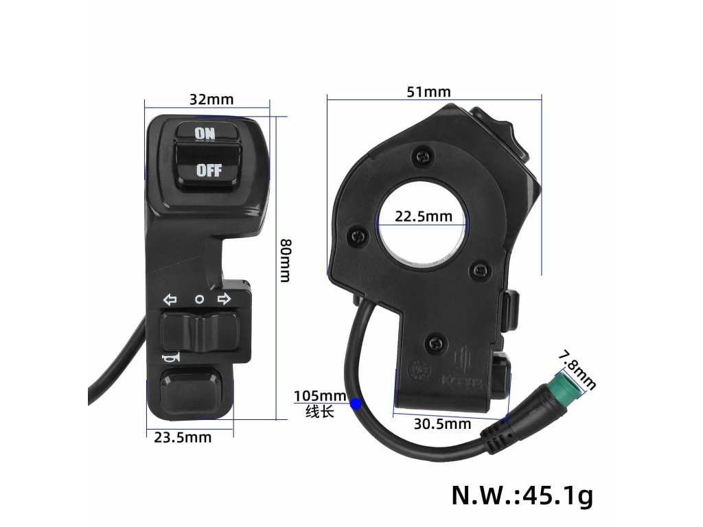 Tento přepínač je navržen speciálně pro model Kukirin G2 Pro a umožňuje pohodlné ovládání světla a dalších funkcí koloběžky. Jedná se o praktický three-in-one přepínač , který zvyšuje komfort ovládání během jízdy.