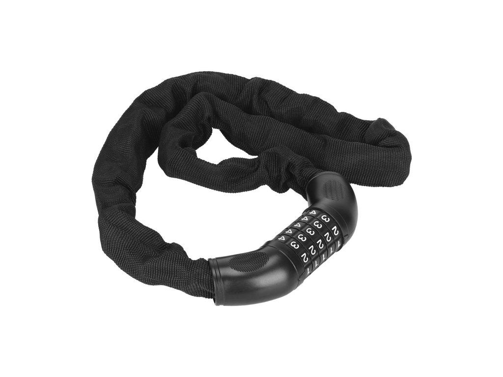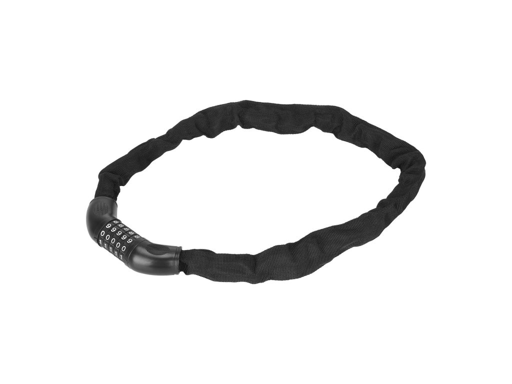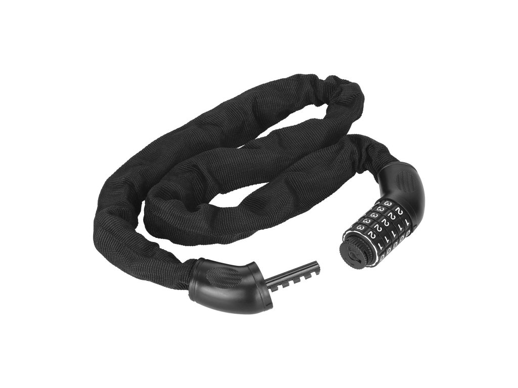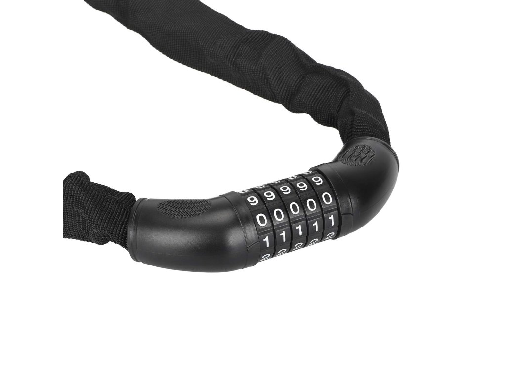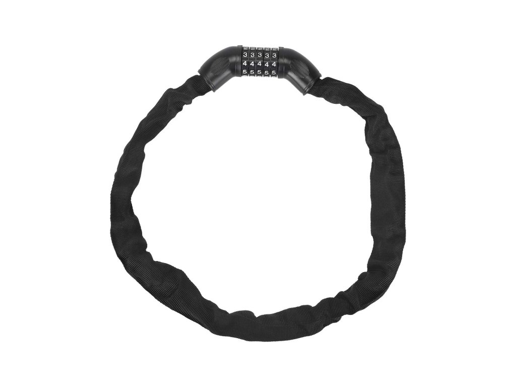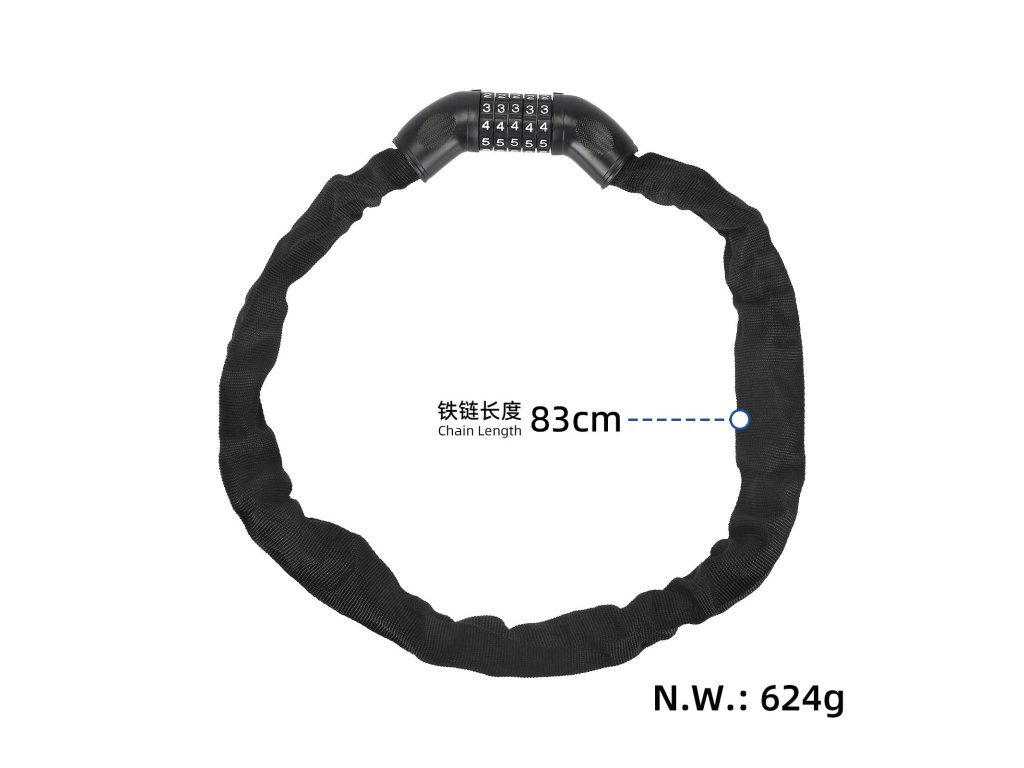 Zámek kombinuje pevný kovový řetěz a bezpečný kombinační mechanismus, který znemožňuje snadné přestřižení nebo odemknutí bez správného kódu.