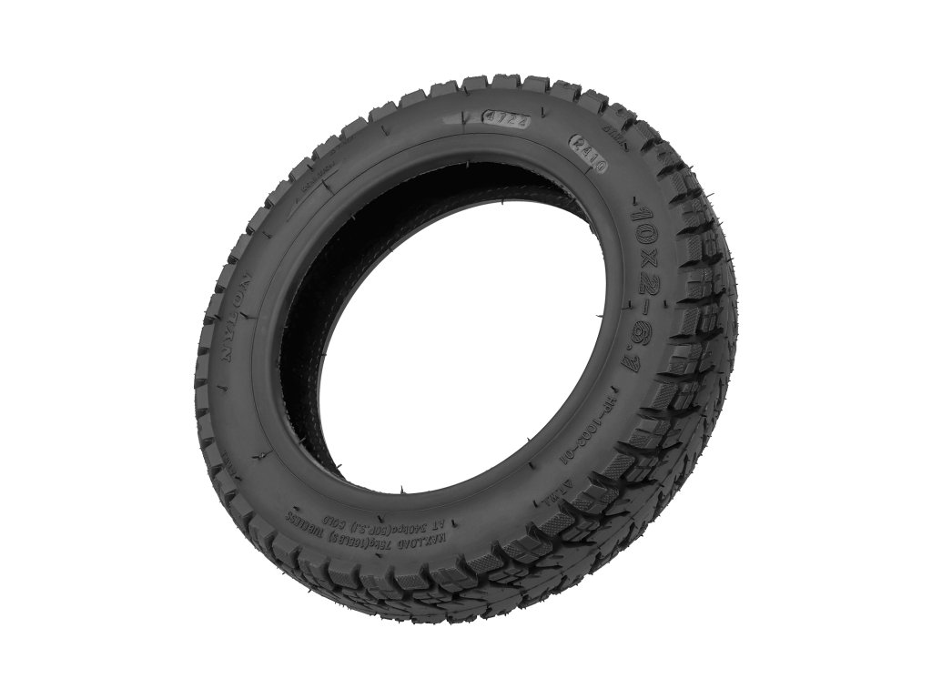 Bezdušová (tubeless) 10″ pneumatika s terénním dezénem pro lepší trakci.