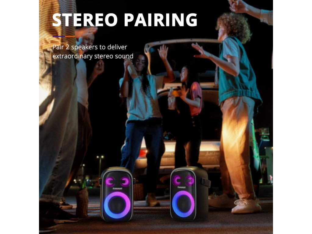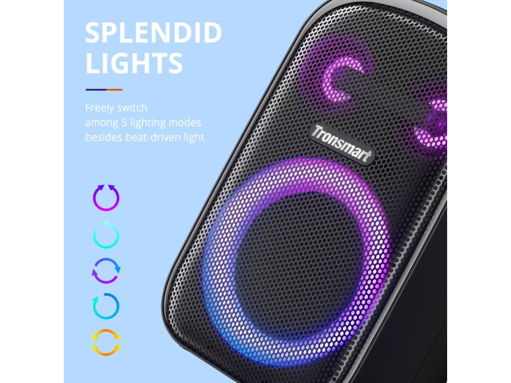 Reproduktor Tronsmart se hodí pro každou příležitost, jelikož je vybaven barevným podsvícením. Můžete libovolně přepínat mezi 5 různými režimy osvětlení, díky čemuž bude každá párty jedinečná. Večer zapněte podsvícení a obdivujte jedinečný vzhled reproduktoru!