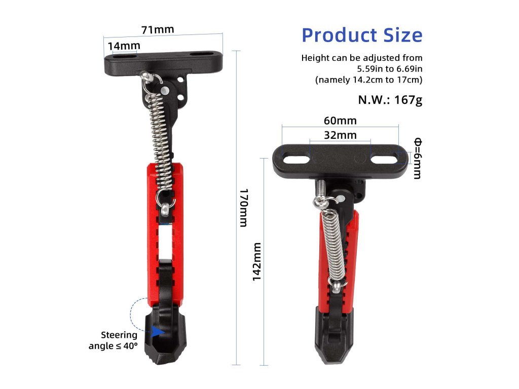 Tento stojan umožňuje snadné nastavení výšky , takže jej můžete přesně přizpůsobit konkrétnímu modelu koloběžky a typu terénu. Správné nastavení zajistí, že koloběžka pevně stojí bez převrácení , ať už parkujete na hladké cyklostezce nebo na nerovném chodníku.